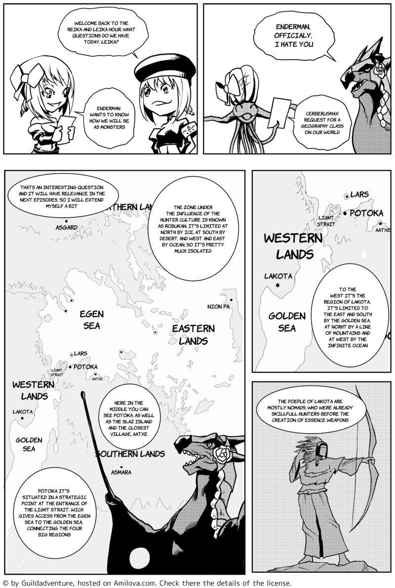 As she said, the north is controlled by the empire of Asgard, the south contains the desert lands of Asmara (where Monster girls on tour begins), limited by a huge desert, the west is the land of Lakota, limited by the infinite ocean at the west and mountains at the north, the east is composed of many isles united under the capital, Nion pa, and the middle tropical zone is composed of merchant villages making profit of the light strait, being Potoka the most important, and the one where most of Guild adventure takes place. Every land has its own kind of races and acceptance on humanoid monsters.