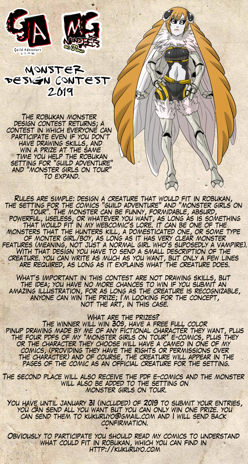 El concurso anual de diseño de monstruos ha vuelto; un concurso donde cualquiera puede participar incluso si no tienen habilidades de dibujo, y ganar un premio al tiempo que ayuda a expandir el trasfondo de los comics Guild adventure y Monster girls on tour.