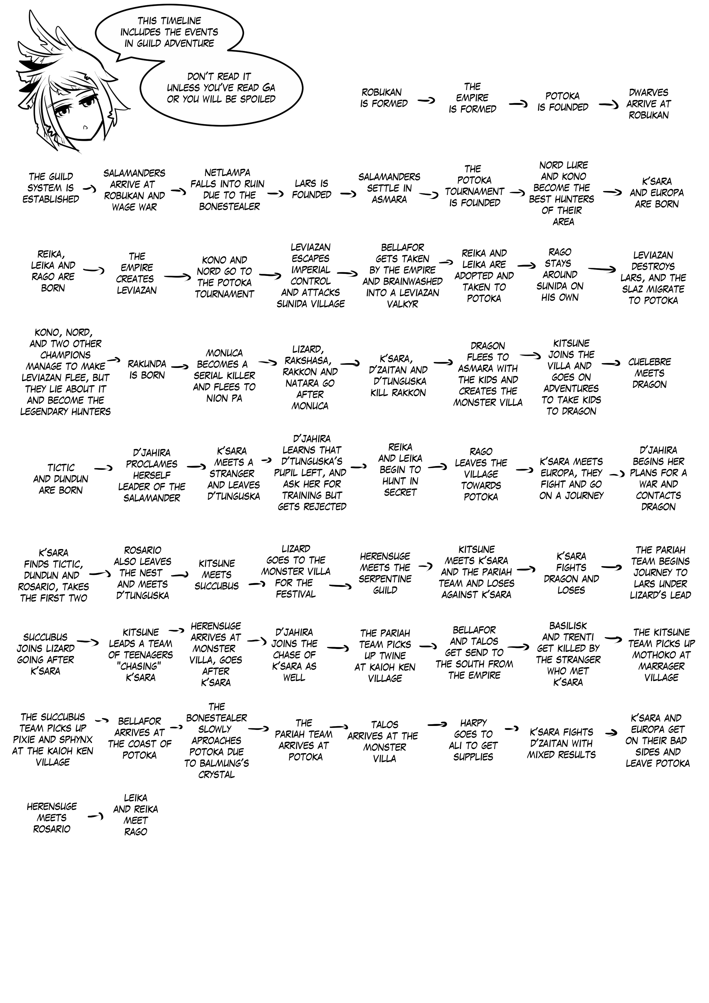 More or less full timeline of events combining what happened in Monster girls on tour and Guild adventure till the beginning of Ga. Read it only if you have read both comics or you’ll be spoiled of them both.