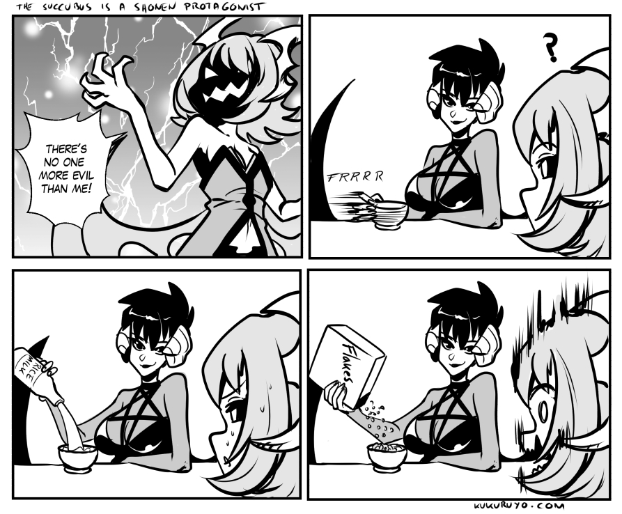 Succubus-chan is pure evil. Read her adventures in The Succubus is a shonen protagonist.