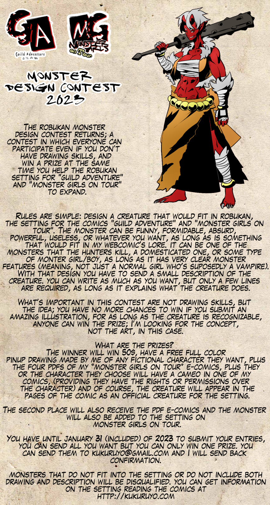 Las reglas son simples: diseña una criatura que podría encajar en Robukan, el trasfondo de los comics Guild adventure y Monster girls on tour. El monstruo puede ser gracioso, formidable, absurdo, poderoso, inútil o lo que quieras, mientras sea algo que creas podrías ver en las páginas de los comics. Puede ser uno de los monstruos que los cazadores eliminan, puede ser una criatura domesticada, o algún tipo de chica o chico monstruo (incompletos en robukan). Ese diseño debe ir acompañado de una descripción, puedes escribir todo lo que quieras pero unas pocas líneas bastaran, mientras explique que es lo que hace la criatura.